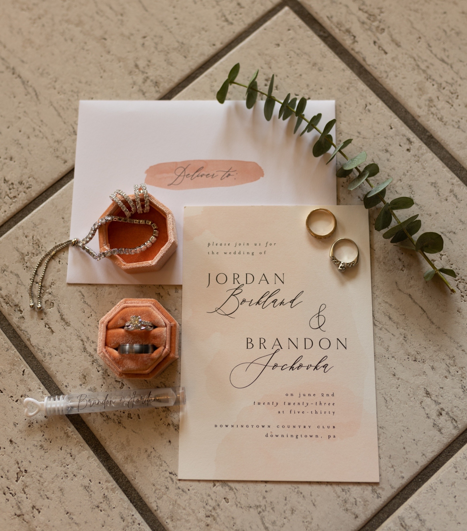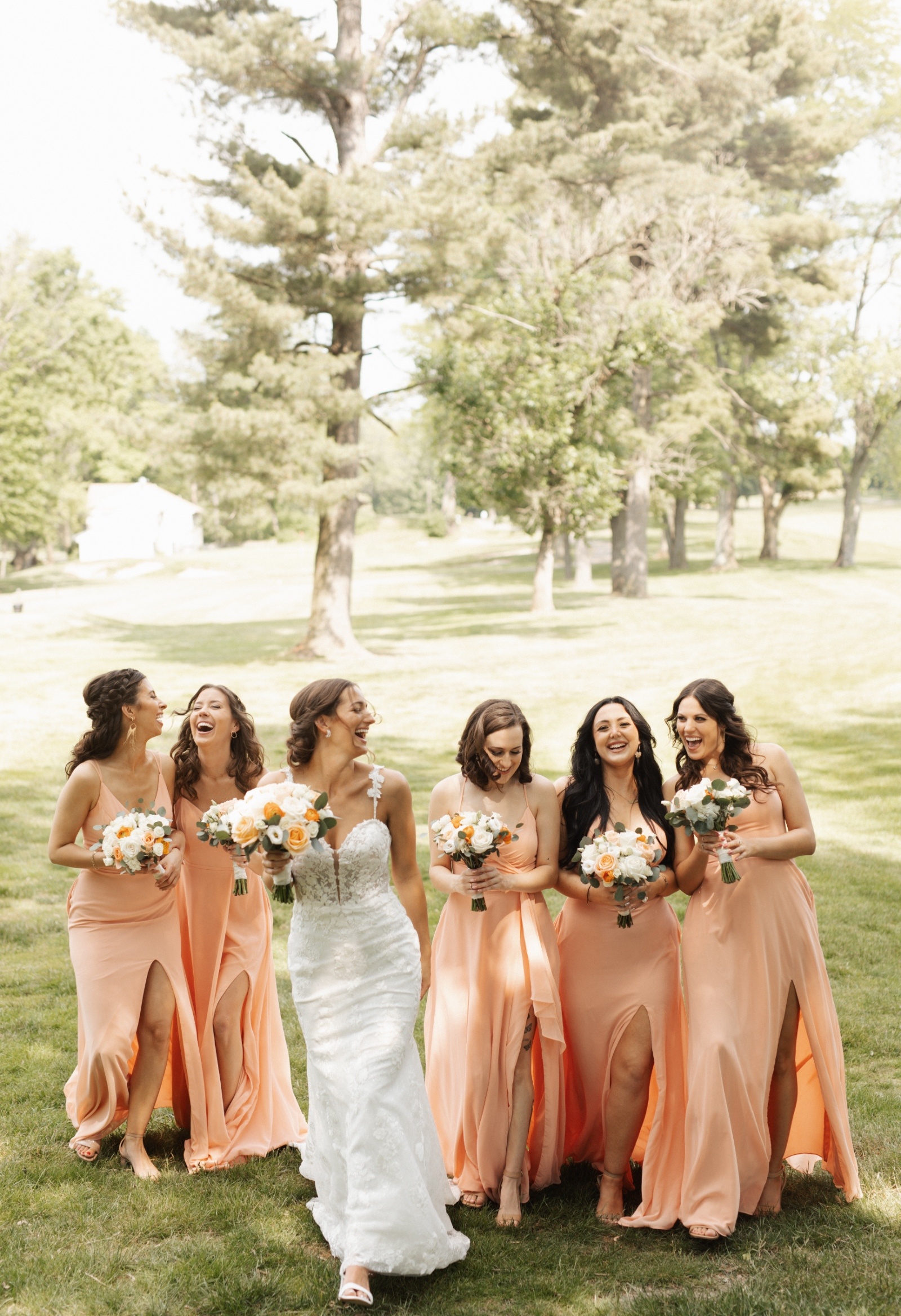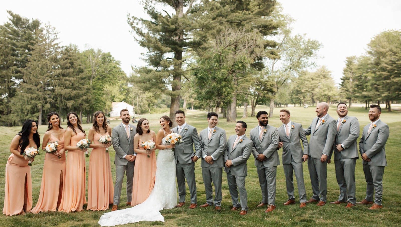 Soft peach tones, glowing summer light, and boho-inspired details made this June wedding at Downingtown Country Club feel effortlessly romantic. From the bridesmaids’ flowing peach gowns to the organic floral arrangements filled with roses and ranunculus, every detail reflected the warmth of the season.