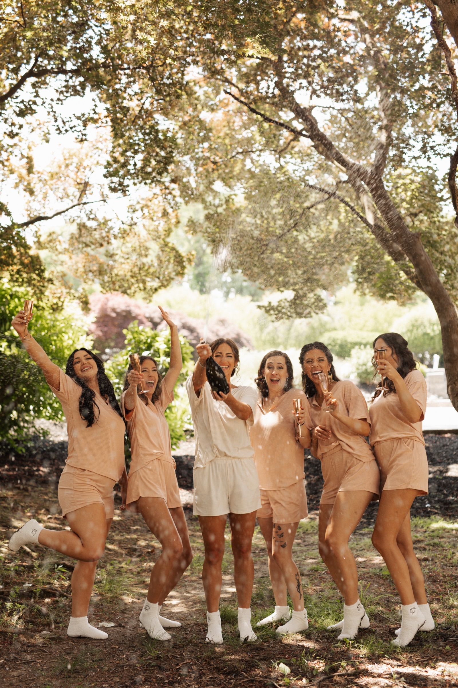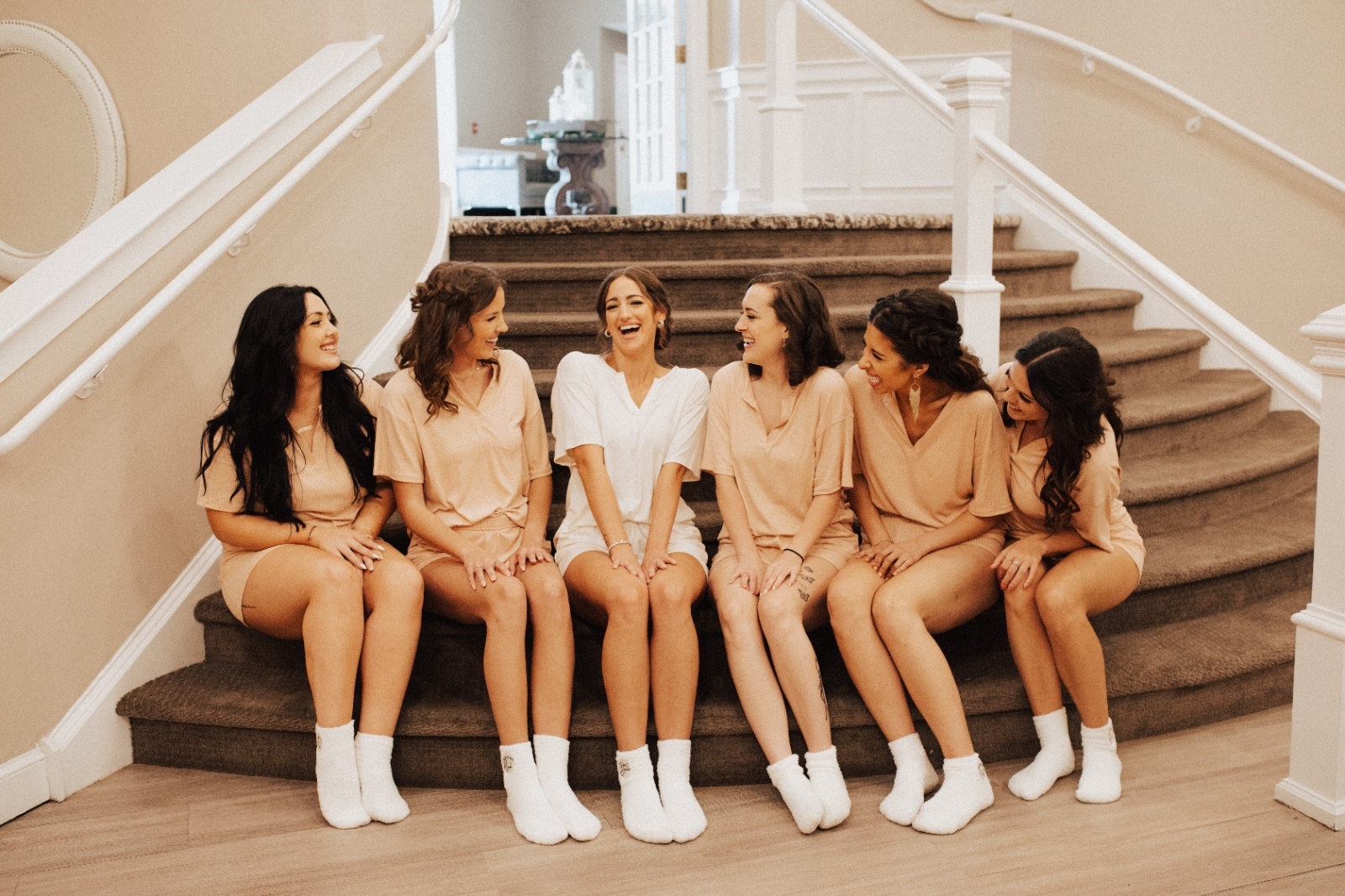 Staying on brand, the bridesmaids rocked matching, two-piece sets in soft peach, while the bride simply glowed in her all-white set. How cute are those custom crew socks?
