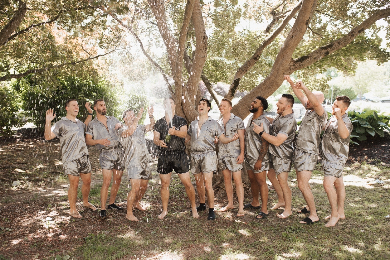 Not to be outdone by the bridal party, the groom and groomsmen also took a moment to pop champagne in their own matching, monogramed two-piece sets.