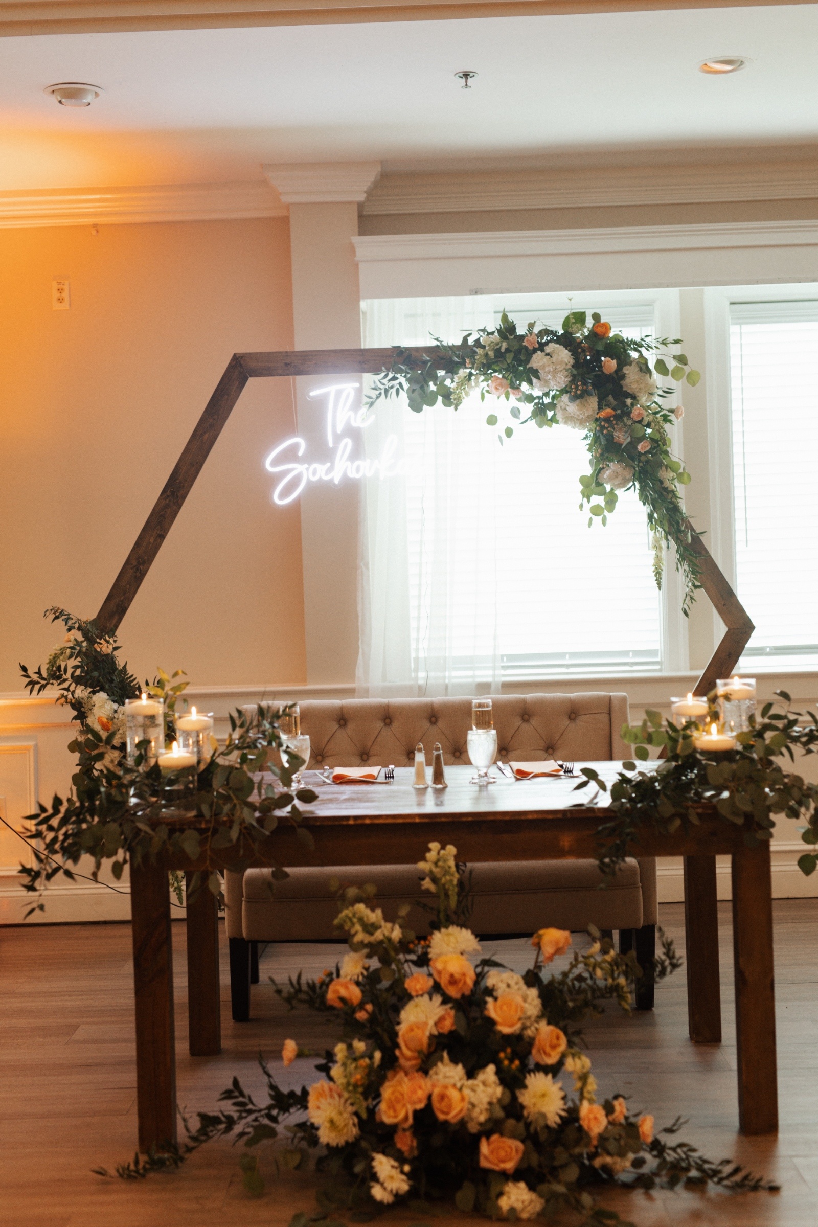 The reception gave romantic, boho vibes with the peachy tones of the table settings, the floating candles and the gorgeous, hexagon arch of the sweetheart table.