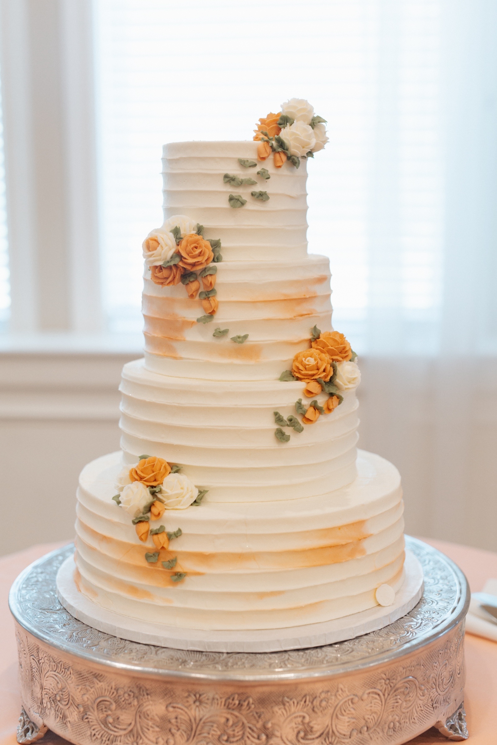 This four-tiered wedding cake feels both classic, with traditional detail, but with a modern twist. Displayed on a stunning silver stand, it was sure to be the centerpiece of the reception.
